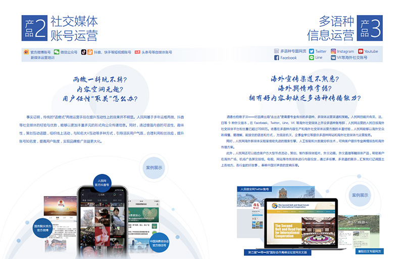 五是專業(yè)的國際傳播能力,助力政企新媒體講好新時(shí)代的中國故事。人民網(wǎng)擁有9種外文版本,在臉書、推特、Line、VK等海外社交媒體平臺(tái)開設(shè)了多語種賬號群,成為提升國際傳播力和影響力的重要渠道。人民運(yùn)營將通過提供國際傳播全媒體解決方案,以有流量的內(nèi)容、有互動(dòng)的發(fā)聲、有量化的效果,幫助政企新媒體提升對外傳播移動(dòng)化、社交化、可視化水平,讓我們遼闊國土上各地方、各行業(yè)的精彩故事閃耀世界。