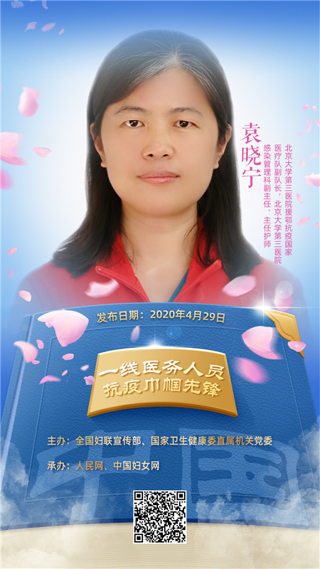 主動(dòng)請(qǐng)纓、率領(lǐng)第一批醫(yī)療隊(duì)于1月26日抵達(dá)武漢,到達(dá)后連續(xù)奮戰(zhàn),先后參與改建運(yùn)行3個(gè)危急重癥病房,建立和推廣駐地管理要求和工作規(guī)章制度流程、培訓(xùn)考核感控知識(shí)技能、動(dòng)態(tài)把握隊(duì)員思想、引導(dǎo)積極情緒、深入污染區(qū)工作督導(dǎo)、患者床旁“話療”,減少了醫(yī)務(wù)人員職業(yè)暴露風(fēng)險(xiǎn),提高了患者戰(zhàn)勝疾病的勇氣,是隊(duì)員心中信賴可親的“袁媽媽”、患者口中“無(wú)所不能的袁隊(duì)”。兼顧其他醫(yī)療隊(duì)指導(dǎo)和國(guó)家感控中心工作,起草了若干團(tuán)體標(biāo)準(zhǔn)與專家共識(shí)。