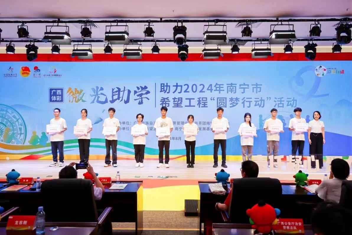 發(fā)布會上,廣西體彩聯(lián)合南寧市希望工程辦公室共同啟動“廣西體彩微光助學”助力2024年南寧市希望工程“圓夢行動”;顒訛樾枰獛椭40名參加2024年高考并被全日制普通高等院校大學本科錄取的高中畢業(yè)生一次性資助5000元。同時,體彩微光助學還為100名家庭困難的學子送上了愛心車票。