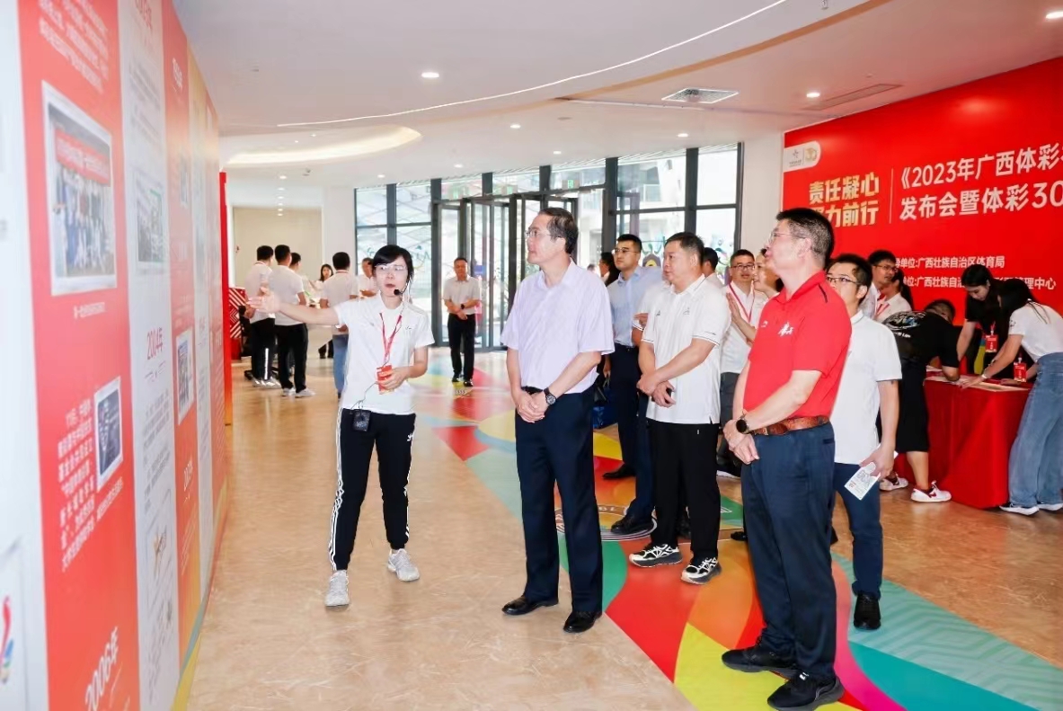 在發(fā)布儀式環(huán)節(jié),自治區(qū)體育局、自治區(qū)財政廳、自治區(qū)公安廳、自治區(qū)體彩中心、世界冠軍代表、體彩追夢人等領導和嘉賓,受邀共同啟動和發(fā)布了《2023年廣西體育彩票社會責任報告》。